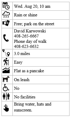 Driving directions:  Take I-280 to the Meridian Avenue exit and bear right (south).  Proceed about 1.3 miles to Hamilton Avenue and turn left.  Continue on Hamilton (which becomes Pine) for 0.8 miles. Turn right on Wilcox Way and go one short block to the park. There is plenty of parking on the street. Look for the walking group nearby.